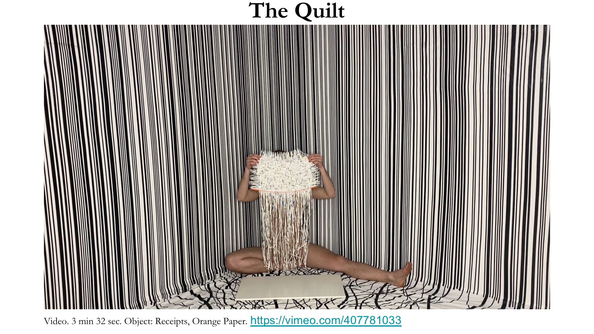 In one performance, the real self is weaving a quilt made of receipts that were shredded, mixed, and glued back together into threads. Receipts are mundane economic debris, but also perfect indexical records of one’s financial existence. By physically deconstructing and then reconstructing these records into an archetypal, sentimental object, the receipts capture the human experience of these transactions. A single orange thread interrupts the production of the quilt, referencing the pandemic’s simultaneous suspension of economic production and social experience.